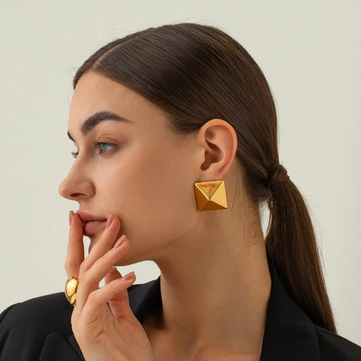"Geometric Gold Pyramid Stud Earrings- Bold Modern Statement"