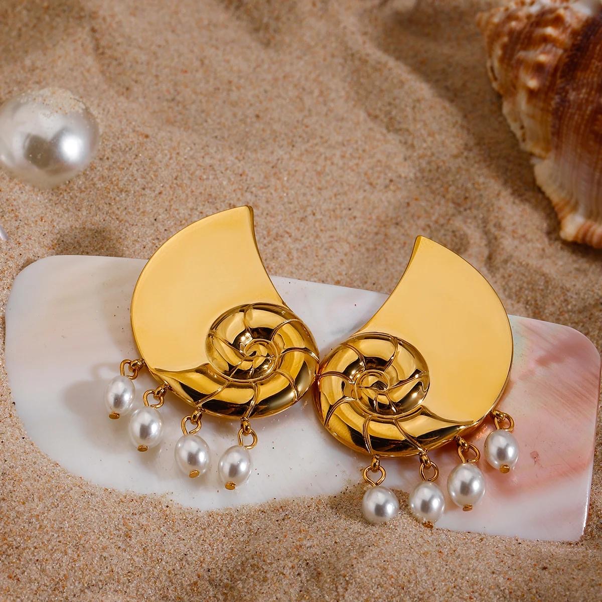 "Gold Shell-Inspired Stud Earrings with pearl Dangling Accents"